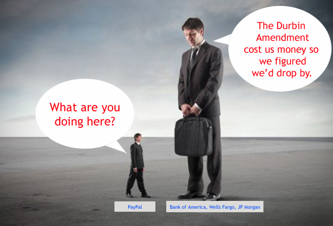 The banks are losing the fight against the Durbin Amendment but don’t count them out yet. The threat of billions dollars losses from interchange fees revenue has inspired them to innovate. So much so that alternative payment processors such as PayPal will soon face the wrath of a sleeping giant.