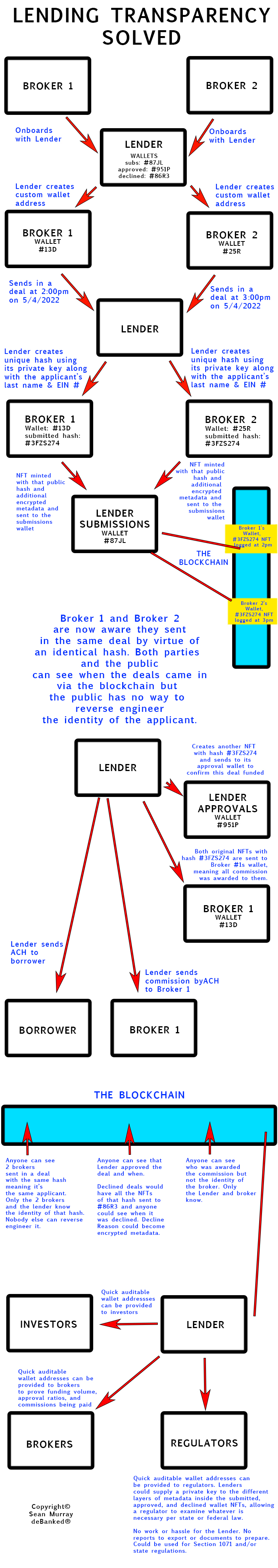 End result: brokers that submit deals can see if their deal has been submitted before and when it was submitted. Brokers can verify if the deal was funded, when, and if commissions were paid to someone. No actual money is changing hands via crypto (though there might be transactions fees to move NFTs around.) Investors and regulators can also examine the flow and if necessary, be given access to a private key so that they can unlock and view the metadata in the submissions, approvals, and declines themselves.